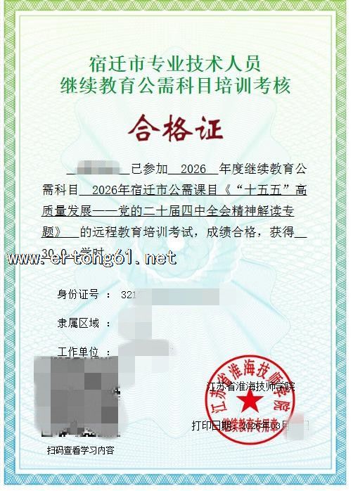 宿迁市2026年专业技术人员继续教育公需科目培训考核合格证