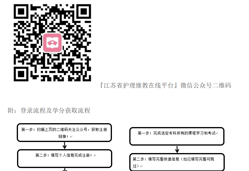 注册护士关注『江苏省护理继教在线平台』微信公众号后,填写相关信息自助注册,账号激活、报名缴费150元,可在app中选择一个专业项目课程。完成缴费后获得账号并下载app,在app中学习并考试,通过后获得省级继续教育I类学分5分。每年缴费学习有效期截止于缴费所在自然年的12月31日。