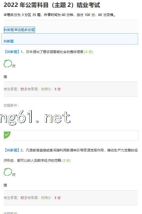2022年公需科目(主题2)结业考试 本卷共分为 3分区 35题,作答时间为 60分钟,总分 100 分,60 分及格。 判断题单选题多选题 判断题 【判断题】1、日本提出了建设超智能社会的整体愿景.(3 分) 参考答案:对 得分:3分