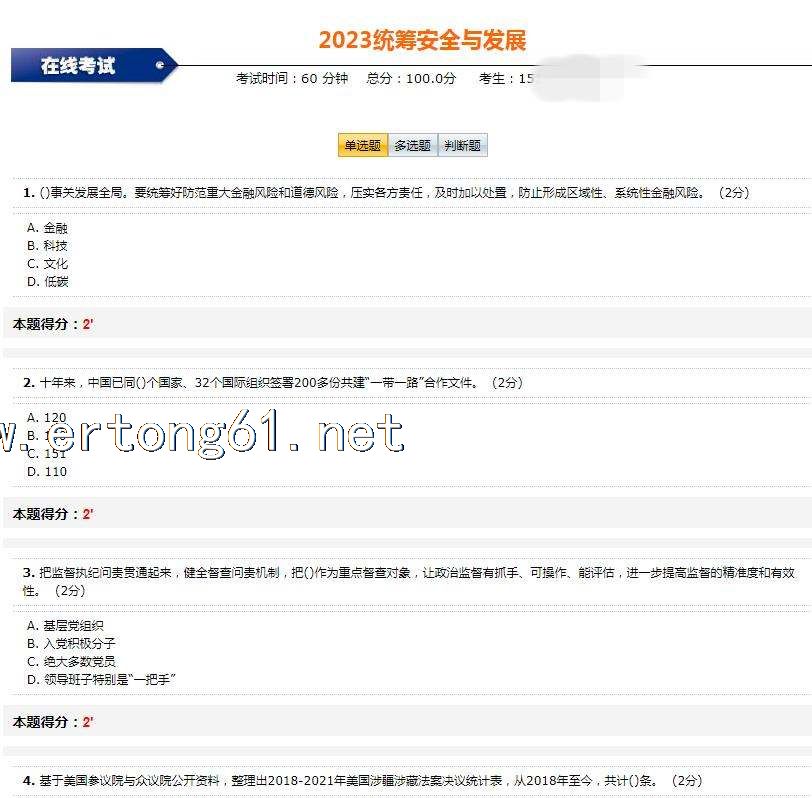 2023湖南继续教育公需课 统筹安全与发展考试答案 湖南人才市场网 题库 需要的朋友请联系朱老师,微信zhu7204 第一章题库 单选题 1、国家安全工作归根结底是保障()。 A.政治安全 B.国家利益 C.人民利益 D.党的执政地位 正确答案: C 2. 多选题《总体国家安全观学习纲要》由()组织编写 A.中央国家安全委员会办公室 B.中宣部 C.中组部 D.国务院新闻办公室 E.国务院办公厅 正确答案: A,B 3. 判断题2021年11月18日,中共中央政治局召开会议,审议《国家安全战略(2021—2025年)》。 正确答案: 正确 第二章 题库 单选题 1、坚持(),聚焦重大自然灾害防控、重点行业领域安全生产、重大灾害事故应急救援的短板和弱项,加快关键核心技术装备研发,建立健全安全应急装备创新发展体制机制,全面提升科技供给能力。 A.四个基本 B.四个重点 C.四个面向 D.四个着力点 正确答案: C 2. 单选题2018年10月10日,习近平总书记主持召开中央财经委员会第三次会议,强调大力提高我国自然灾害防治能力,提出要针对关键领域和薄弱环节,推动建设()大重点工程。 A.6 B.7 C.8 D.9 正确答案: D 3. 单选题( )成为关键生产要素和战略性资源。 A.数据 B.人才 C.装备 D.材料 正确答案: A 1、()事关发展全局。要统筹好防范重大金融风险和道德风险,压实各方责任,及时加以处置,防止形成区域性、系统性金融风险。 A 金融 B 科技 C 文化 D 低碳 2、十年来,中国已同()个国家、32个国际组织签署200多份共建“一带一路”合作文件。 A 120 B130 C 151 D 110 3、把监督执纪问责贯通起来,健全监督问责机制,把()作为重点督查对象,让政治监督有抓手、可操作…… ----------- 更多试题答案,请联系朱老师,微信zhu7204 ------------------------------------------------------------------------------------- |