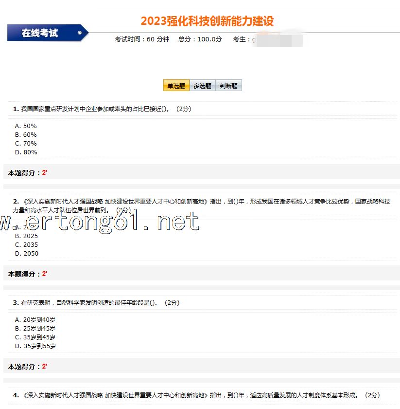 湖南人才市场网 2023年继续教育公需课 强化科技创新能力建设 考试答案 题库 需要的朋友请联系朱老师,微信zhu7204 题库答案 第一章 习题1 单选题在制度保障方面,习近平总书记强调要坚持以()激发创新活力。 A.改革开放 B.国际合作 C.高质量发展 D.深化改革 正确答案: D 2. 单选题坚持创新驱动实质是()驱动。 A.制度 B.人才 C.发展 D.改革 正确答案: B 3. 多选题党的十九届五中全会进一步明确了创新在我国现代化建设全局中的核心地位,提出“四个面向”,即()。 A.面向人类命运共同体 B.面向世界科技前沿 C.面向经济主战场 D.面向国家重大需求 E.面向人民生命健康 正确答案: B,C,D,E 4. 多选题在安全保障方面,习近平总书记强调要坚持统筹(),善于预见和预判各种风险挑战。 A.发展 B.改革 C.开放 D.安全 E.创新 正确答案: A,D 5. 判断题中国特色社会主义进入新时代后,科技现代化开始成为中国式现代化的重要内容。 正确答案: 错误 6. 判断题近代以来,由于国内外各种原因,中国屡次与全球科技革命和产业变革失之交臂。 正确答案: 正确 单选题《国家创新驱动发展战略纲要》中的“一个体系”是建设()体系。 A.科技创新 B.国家创新 C.省级创新 D.区域创新 正确答案: B 2. 单选题《国家创新驱动发展战略纲要》明确了()个重要领域的技术发展方向。 A.七 B.八 C.九 D.十 正确答案: C 3. 多选题双轮驱动中的双轮是指()。 A.新发展理念 B.新发展格局 C.基础研究创新 D.科技创新 E.体制机制创新 正确答案: D,E 4. 判断题《党和国家机构改革方案》指出,将组建中央科技委员会。 正确答案: 正确 1、我国国家重点研发计划中企业参加或牵头的占比已接近() A 50% B 60% C 70% D 80% 2、《深入实施新时代人才强国战略 加快建设世界重要人才中心和创新高地》指出,到()年,形成我国在诸多领域人才 3、有研究表明,自然科学家发明创造的最佳年龄段是 --------------------------- 更多考试试题答案,欢迎联系朱老师,微信zhu7204 -------------------------------------------- |