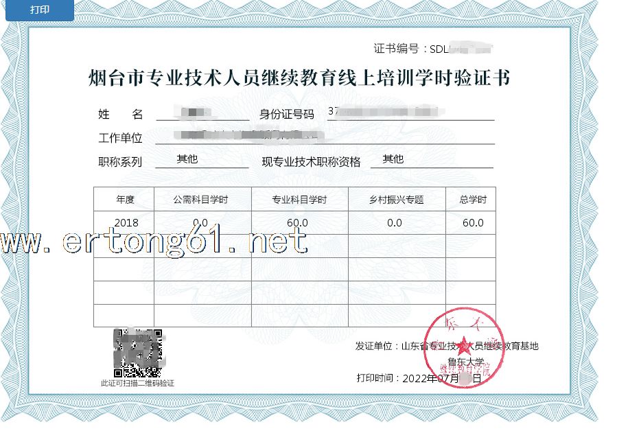 山东烟台专业技术人员继续教育专业课学时验证书 扫码快速学习获取证书