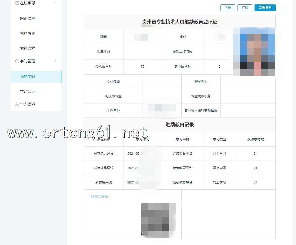 贵州省专业技术人员继续教育公需课学时证明