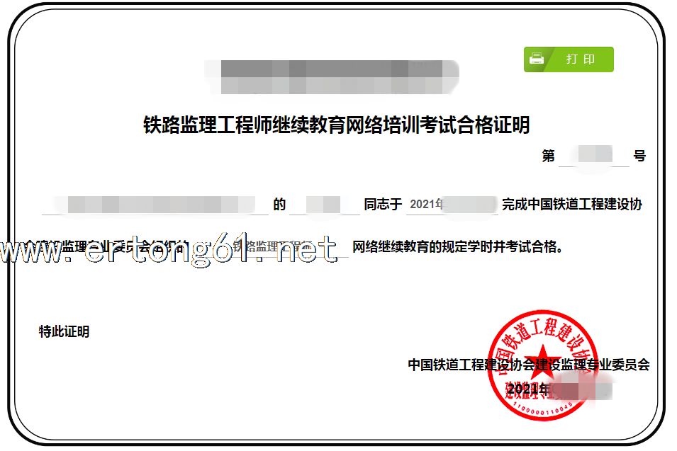 铁路监理工程师网络继续教育合格证明